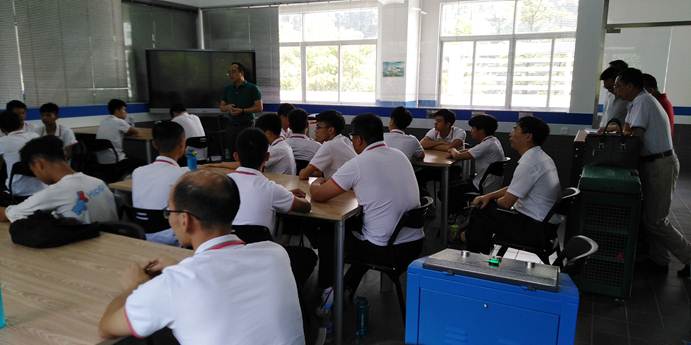 在顺德中专汽修大楼里面,同学们看到领导、老师们的到来非常高兴。院长余华明首先向所有新生问好,介绍了顺德职院及能源与汽车工程学院的概况,并详细介绍了汽车专业的发展前景,讲解了顺德职院专业学院大学生学习、生活等方面的管理标准和要求。最后,他嘱咐同学们要珍惜上学的机会,好好学习专业技能,一定要按高标准严格要求自己。
