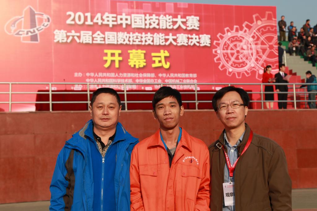 2014年9月,由李文辉、孙文斌老师指导,陈伟键同学参加了第六届全国数控技能大赛广东省选拔赛,夺得第一名;紧接着进行了近两个月备战国赛的刻苦强化训练,于2014年10月31日至11月8日代表广东省高职院校在北京参加全国总决赛,经过理论、软件编程与仿真、实操加工等一系列竞赛环节,一鼓作气再夺全国技能大赛冠军。