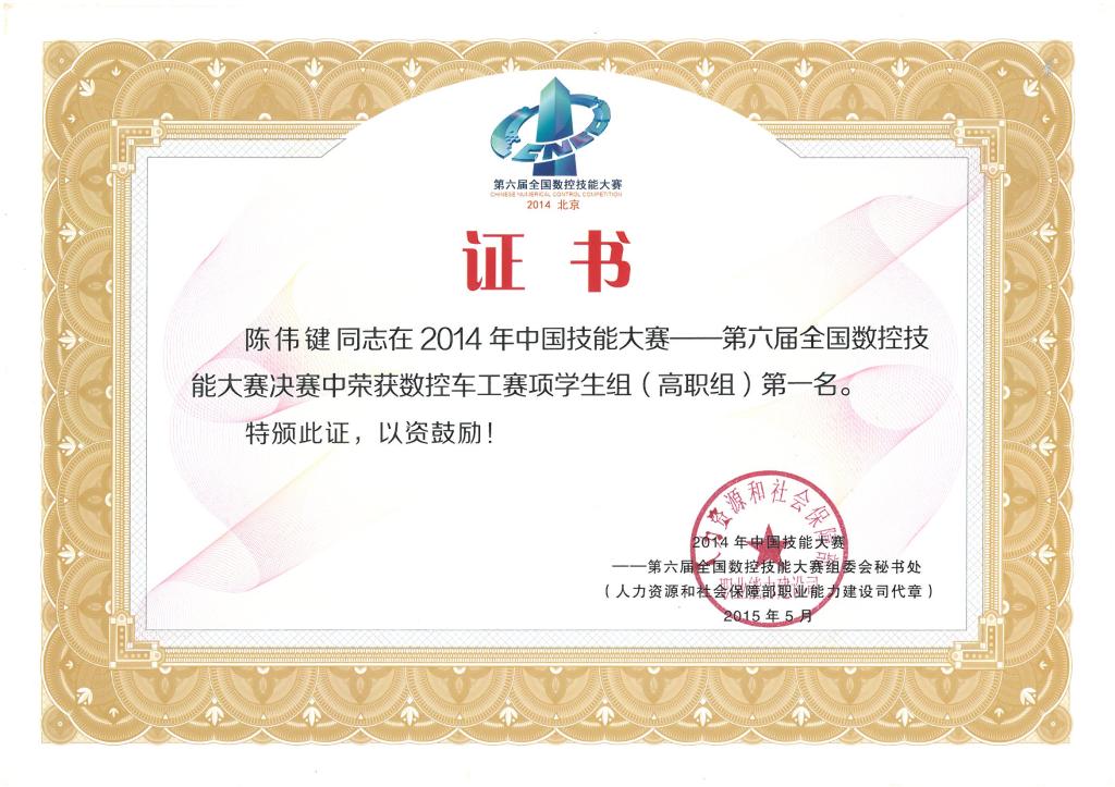 2015年12月17日,人力资源和社会保障部给我校发来获奖荣誉证书:“2014年中国技能大赛——第六届全国数控技能大赛决赛数控车工赛项学生组(高职组)第一名”。获此殊荣的是我校机电工程学院数控专业陈伟键同学,他也因此直接晋升技师职业资格。