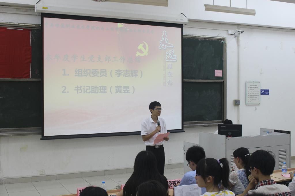 大会在全体奏唱《义勇军进行曲》的严肃氛围中拉开帷幕。本次换届大会恰逢中国共产党成立94周年的日子,大会正式开始前,来自机电工程学院新发展的预备党员谭嘉宏、李文侠、黄丽丹在党旗下进行了庄严地入党宣誓。接下来学生党支部及素质拓展中心都以一段视频展开自己的工作汇报。视频中记录着各部门在本学年度的工作历程,也定格了每次活动中的欢乐瞬间。视频结束后,两大组织的学生干部分别对本学度进行了具体的工作总结与分享学生干部的成长。随后,两个组织开始了紧张的竞选,每位候选人分别从加入组织将近一年来的成长历程、收获以及对组织未来的展望进行竞选演讲,并根据在座各组织代表的投票结果选出了两个部门新一届的干部。最后,两个部门代表宣布候选结果,并向当选新一届的学生干部们送上祝福,鼓励他们在今后的工作中继续好好表现,在锻炼自己组织管理能力的同时让组织越来越出色。在本次大会中,廖翠玲老师对本学年度中各部门工作人员的辛苦付出给予了肯定,期待在接下来的时间里,在新一任干部的带领下,每一个人继续坚守各自的岗位,让两大家庭为机电工程学院做出更多的贡献。