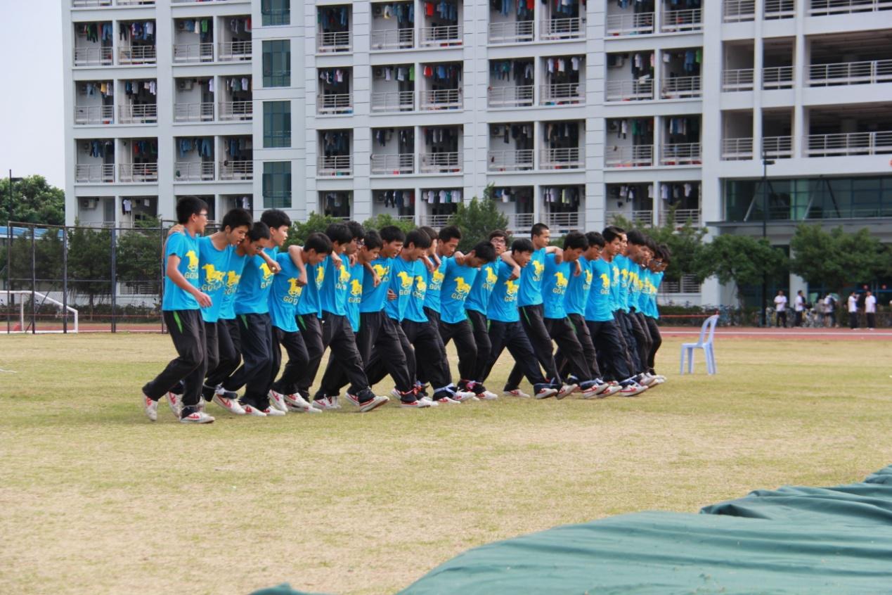 比赛开始之前,每个参赛的班级都努力地训练,为了体验班级集体训练的结果,同时希望取得好成绩。在赛道上,每个同学的两脚分别和相邻的人绑在一起,组成30人一组的队伍,14级所有的班级共计14支代表队参赛。作为一项集趣味、健身于一体的项目,30位同学必须保持步调的高度一致,才能顺利到达终点,这对学生们的团结协作能力是一个极大的考验。训练有素的队伍在口令声中整齐地迈出第一步,30位同学紧紧搂在一起,脚并脚,肩并肩,喊着口号向终点前进,最后集体扑倒在准备好的软垫上。当然也有出现失误的队伍,如果有一名队员意外跌到,受到连累的队友们就在草地上摔得东倒西歪,场面乐趣横生。