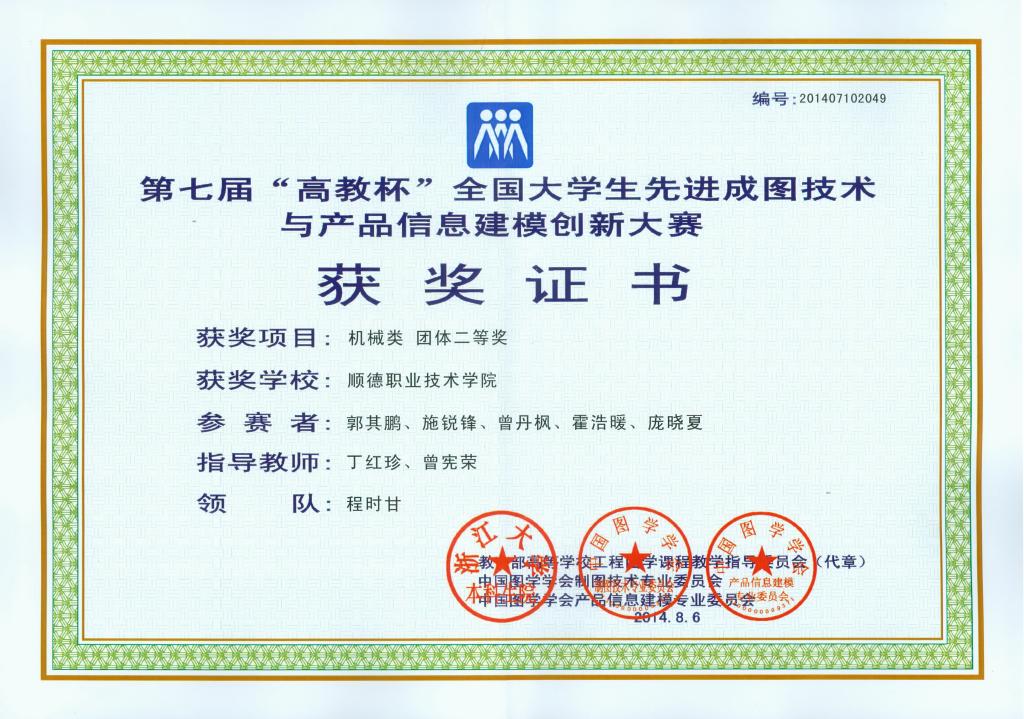 8月4日至6日,教育部高等学校工程图学课程教学指导委员会、中国图学学会制图技术专业委员会、中国图学学会产品信息建模专业委员会主办的“第七届‘高教杯’全国大学生先进成图技术与产品信息建模创新大赛”在三峡大学隆重举行。我校机电工程学院由程时甘老师领队,丁红珍、曾宪荣老师为指导教师,霍浩暖、庞晓夏、曾丹枫、郭其鹏、施锐锋五名同学组成顺德职业技术学院代表队参加本次大赛机械类比赛,取得优异成绩,荣获机械类团体二等奖,并同时获个人一等奖2项,个人二等奖5项,成绩名列高职院校前茅,是广东省参赛队伍中成绩最好且唯一获得团体奖的高职高专院校。