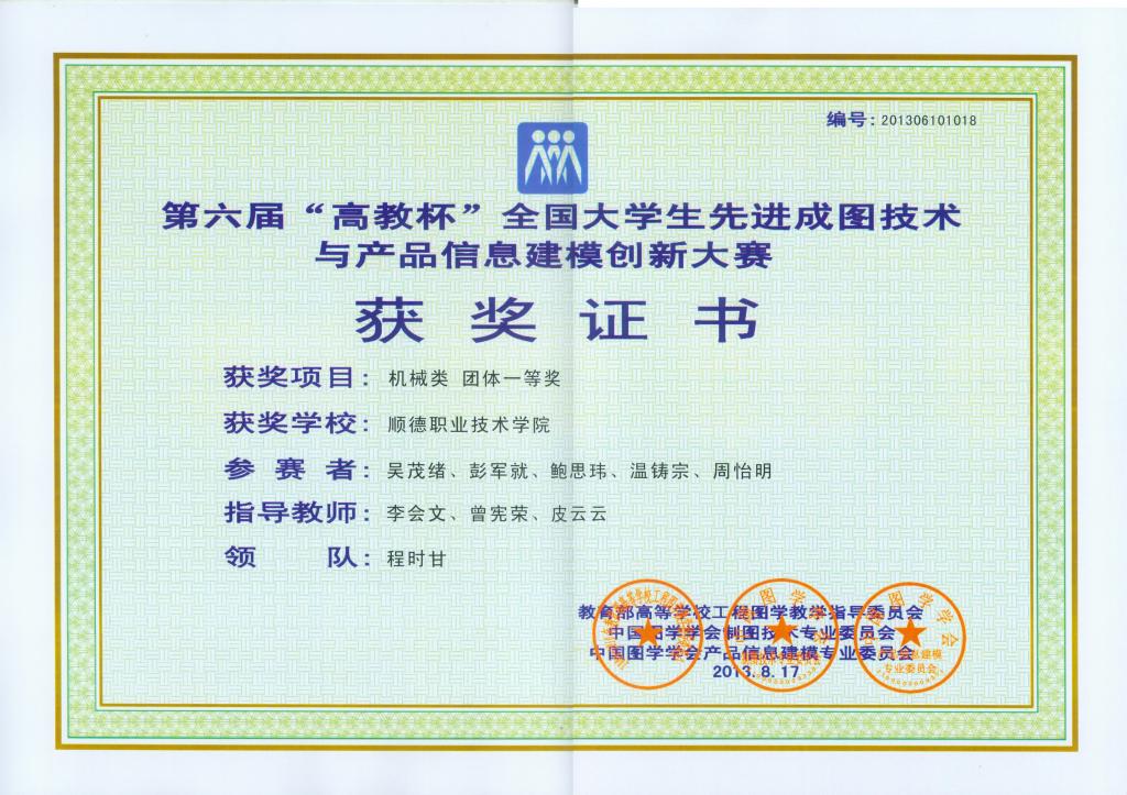 8月15日-17日,由教育部高等学校工程图学教学指导委员会、中国图学学会制图技术专业委员会、中国图学学会产品信息建模专业委员会共同主办,华南农业大学承办的第六届全国大学生先进成图技术与产品信息建模创新大赛在广州华南农业大学举行。来自武汉大学、东北大学、哈尔滨工业大学、北京科技大学等全国126所本科和高职高专院校的161支团队,总计1212名学生报名参赛。其中,机械类参赛团队115支,总计846人。大赛分机械、建筑、道桥、水利4个类别,内容包括尺规绘图、产品信息建模及工程图绘制两部分。我校机电工程系在暑假期间认真组织学生进行赛前培训,选派5名同学组成顺德职业技术学院代表队参加机械类比赛。由于组织得力、准备充分,最终取得优异成绩,荣获机械类团体一等奖,是获得团体一等奖仅有的两所高职高专院校之一,并同时荣获个人一等奖4项,个人二等奖4项。