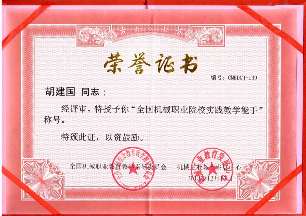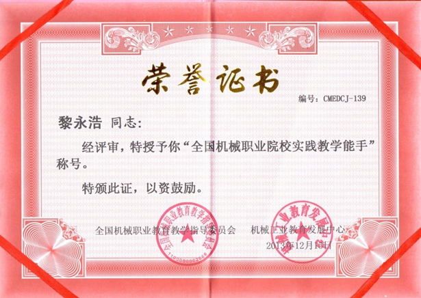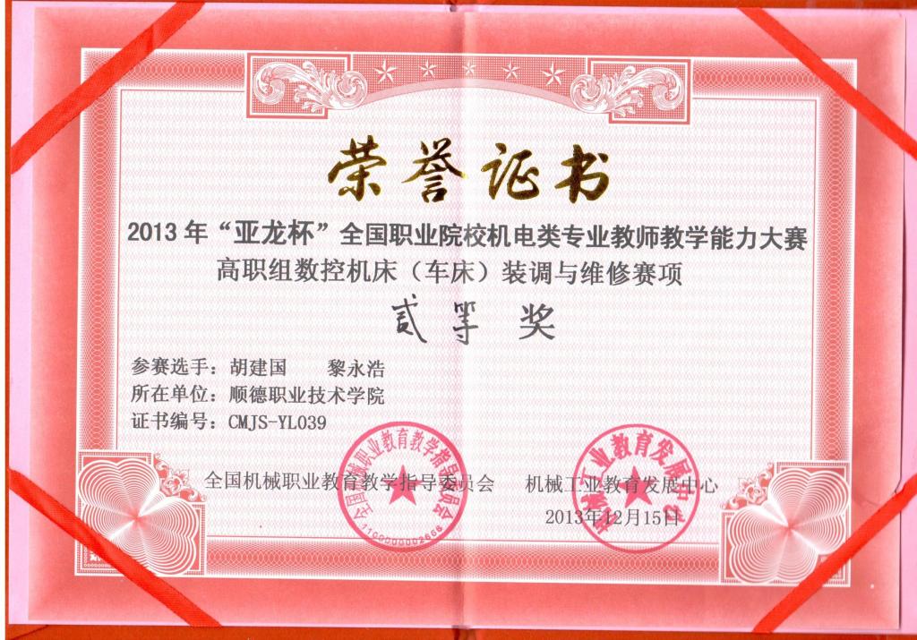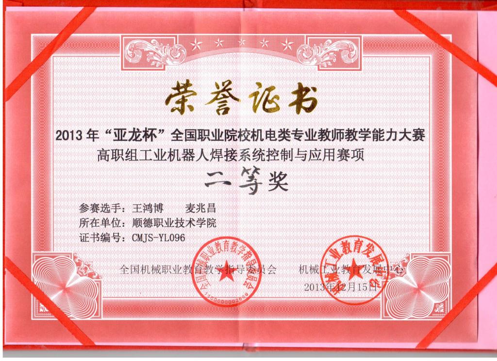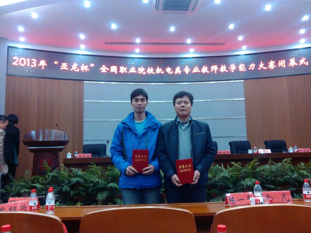 2013年12月13日至15日,全国机械职业教育教学指导委员会、机械工业教育发展中心主办的全国职业院校“机电类专业教师教学能力”大赛在江苏、浙江等地隆重举行。我校机电工程学院选派王鸿博、麦兆昌、胡建国、黎永浩四位老师组成两只代表队,参加“工业机器人系统控制与应用”、“数控机床(车床)装调与维修”两个赛项的角逐,均荣获“二等奖”,同时荣获“全国机械职业院校实践教学能手”称号。